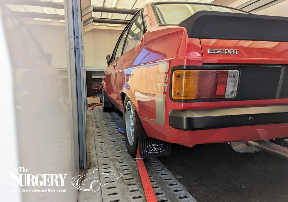 Ford Escort 1600 Sport on its way into the workshop. Won’t be long until it’s back on the road, once again.